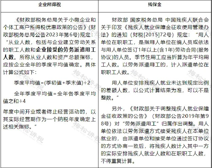 (1)企业所得税的从业人数包括企业接受的劳务派遣用工人数,而残保金的人数中,首先,劳务派遣人员是属于派出方的,其次,以派遣方式接受残疾人在本单位就业的,人员归属由派遣单位和接受单位通过签订协议的方式协商确定归属,这也可能存在口径差异。所以在人数统计方面,企业所得税口径的人数和残保金的职工人数就存在差异。